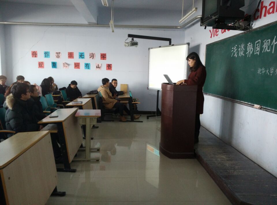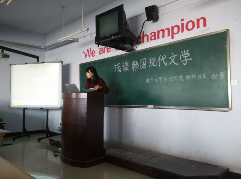 2015年11月18日,北华大学bet5365.net朝鲜语专业张蕾老师开展了一次主题为“浅谈韩国现代文学”的讲座。张蕾老师毕业于韩国忠南大学,文学博士,研究方向为韩国现代文学。有bet5365.net教师,朝鲜语专业学生,以及校内文学爱好者聆听了此次讲座。张蕾老师介绍了韩国现在文学的脉络,并从韩国现代文学的内外空间等方面切入主题,介绍了韩国现代文学的研究现况。