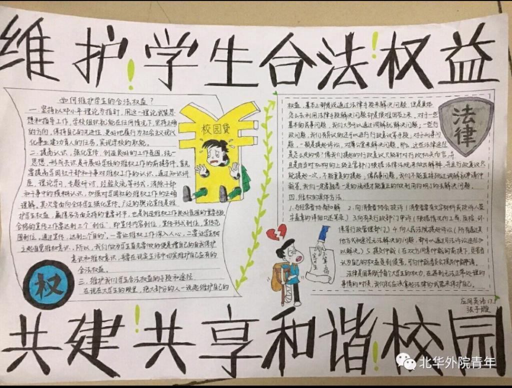 当代大学生普遍缺乏权益知识,更缺乏维护权益的意识,,此次手抄报设计活动增加了学生的法律常识,增强了学生维护自身合法权益的意识。使学生在以后权益受到损害时懂得用法律的武器维护合法权益。