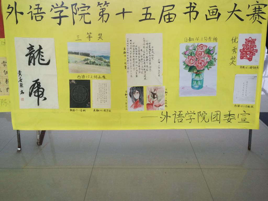 16、17级上百名学生参加了比赛,作品的质量出色,种类繁多,包括了硬笔书法,软笔书法,国画,素描,水彩等。本次比赛中,孙立岩、曹思佳、尹莉三名同学荣获一等奖。王金涵、黄春强、陈研希、刘晓彤、赵岳莹、陈曦六名同学荣获二等奖。王惠、姜红爽、郭宝玉、张欣悦、戴慧敏、刘贺、姜珊、何函缘、勾秀楠九名同学荣获三等奖。余钰兰、薛晨、郭梦瑶、郝翎秀、熊荣梅、刘畅、迟月、牛猛、郝晓荠、冯婉娱十名同学获优秀奖。